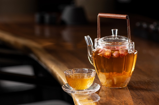 「暖心暖邑」茶饮:胎菊暖手柚子茶38元/杯;玫瑰雪梨煮白茶48元/壶;苹果养生红茶58元/壶。