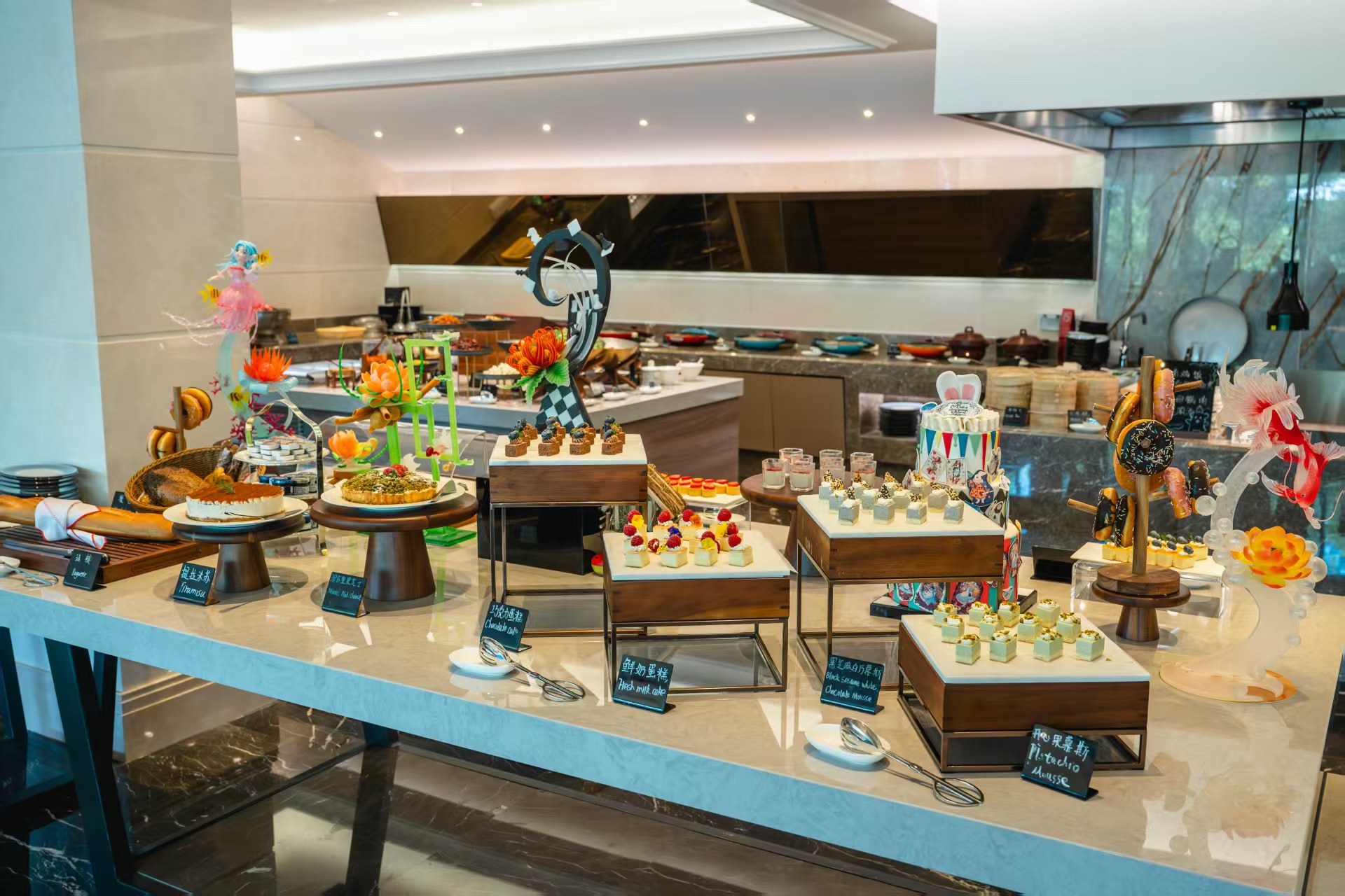 淡雅清逸的色调,魅力花园的迷人风姿,窗外美景一览无余。在牡丹厅自助餐厅内,您可以品尝到各式中西式美食,在享受美食的同时,也能欣赏到睦如居广场前锦鲤池的瀑布美景,优美环境带来典雅舒适的享受。