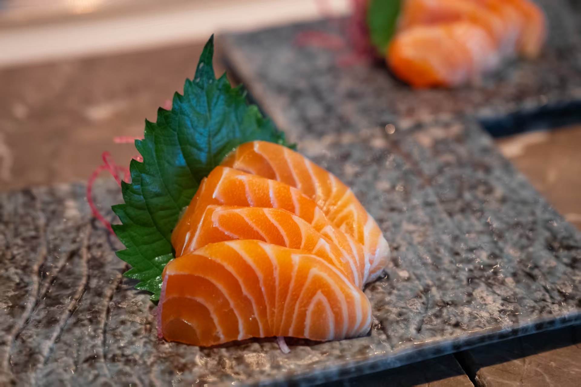 厨师现场现切肥嫩细腻的三文鱼刺身