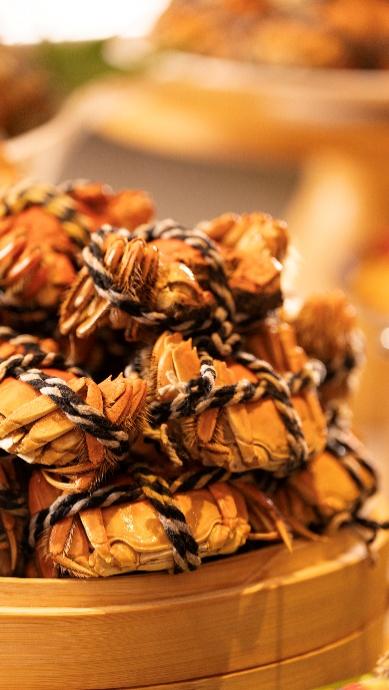酒醉大闸蟹严选肥美膏蟹,以陈年花雕与秘制香料浸润,酒香醇厚,蟹黄凝脂如金,蟹膏丰腴醇香,每一只皆是时令风物的醉人表达;清蒸大闸蟹以清蒸技法锁住食材本真本味,鲜嫩蟹肉在舌尖舞动,尽享秋日食韵风华;咸蛋黄炒大闸蟹将沙糯咸香与蟹肉鲜甜融汇碰撞,咸蛋黄如金沙般裹夹蟹身,惹味非凡;蟹粉捞面选用现拆蟹粉与蟹黄制成浇头,捞匀于爽滑面条之上,鲜甜香气被全数吸纳进软滑面条里,是致敬江南雅韵的至醇之味。