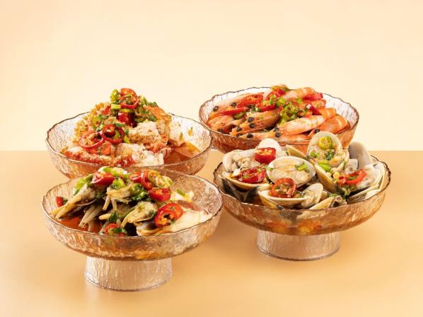 捞汁熟海鲜将文蛤、大虾、蛏子、红毛蟹脚以秘制捞汁浸渍,酸辣汁水激发出海洋鲜物的本真滋味;普宁豆酱焗鮰鱼以古法烹制,豆酱的咸香衬托出鱼肉的细腻清甜;港式猪排饭精选厚切带骨猪排,秘制酱汁渗透肌理;现做油浸东海带鱼以高温锁鲜,外皮如银鳞闪烁,肉质细腻如脂;中式烤乳猪皮脆如琥珀,肉嫩如脂膏;烧烤档的烤羊排外焦里嫩,脂香丰盈;更有弹牙酱浓的阿公鱿鱼、外脆里嫩的香酥蝴蝶腿、金黄酥脆的油墩子,重现老上海弄堂的烟火气。