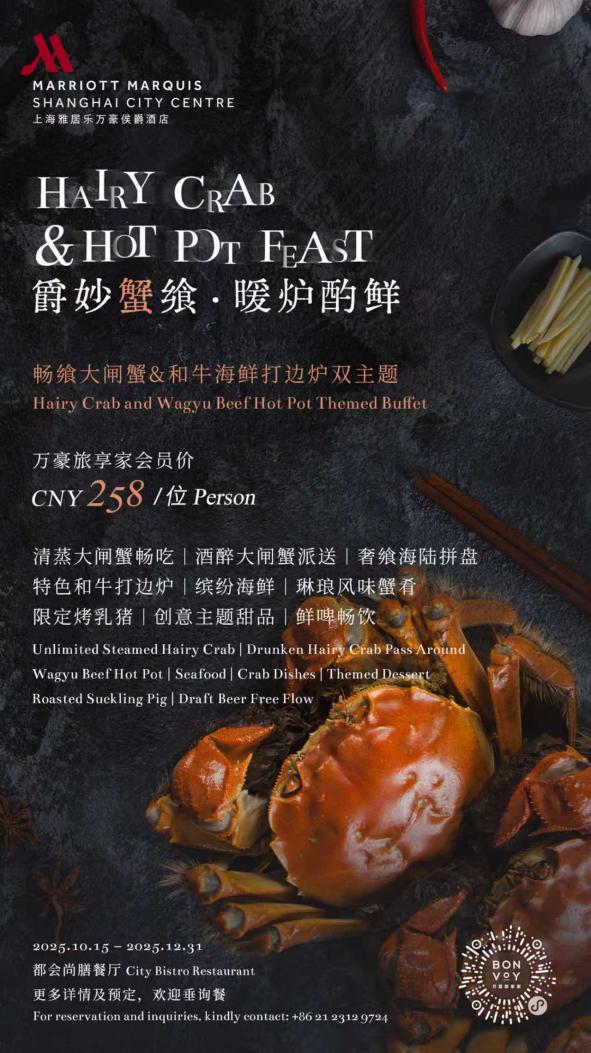 中国上海,2025年10月 —— 爵妙蟹飨,暖炉酌鲜。当时令飨食美学与温润锅物哲学相遇,上海雅居乐万豪侯爵酒店都会尚膳餐厅以“鲜”入馔,甄呈【畅飨大闸蟹&和牛海鲜打边炉】双主题自助盛宴。集四方臻味与匠意风滋,即日起至2025年12月31日,邀食客们恣意奢享这场跨越山海、交织中西的味觉香诒之蕴,解锁至臻味蕾绮旅。