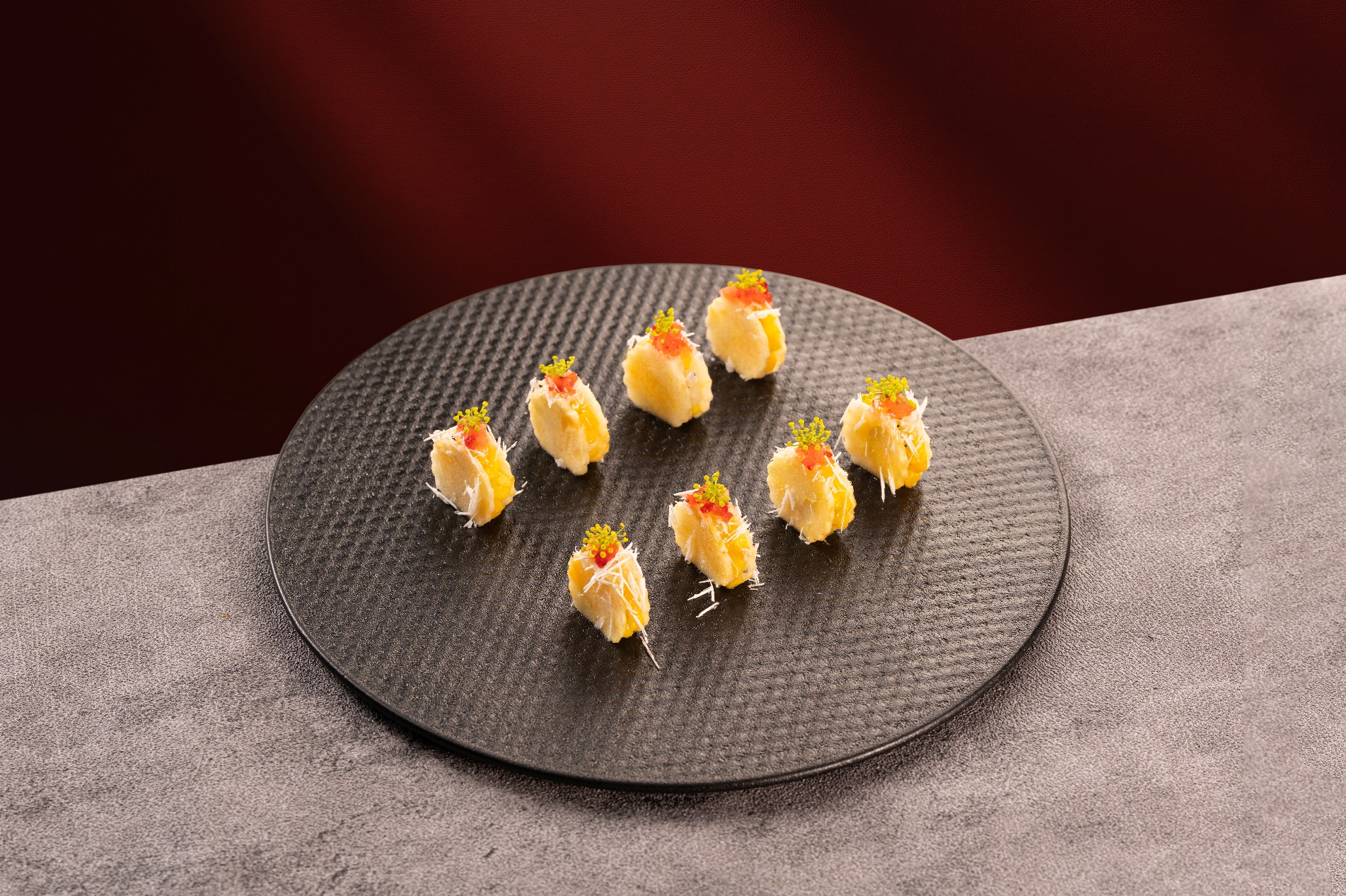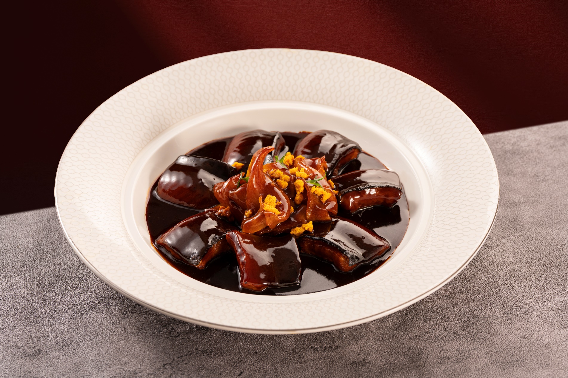甄选鲜活河鳗,去骨淋油,文火慢煎至表皮金香。注入浓郁高汤,细炖至肉质八分柔韧,再佐以花胶共煮。待汤汁收浓,融入新鲜海胆,海味丰盈四溢。酱香馥郁中,鳗鱼的细腻与花胶的胶质相得益彰,柔滑醇厚,一口尽享海之鲜、陆之香。