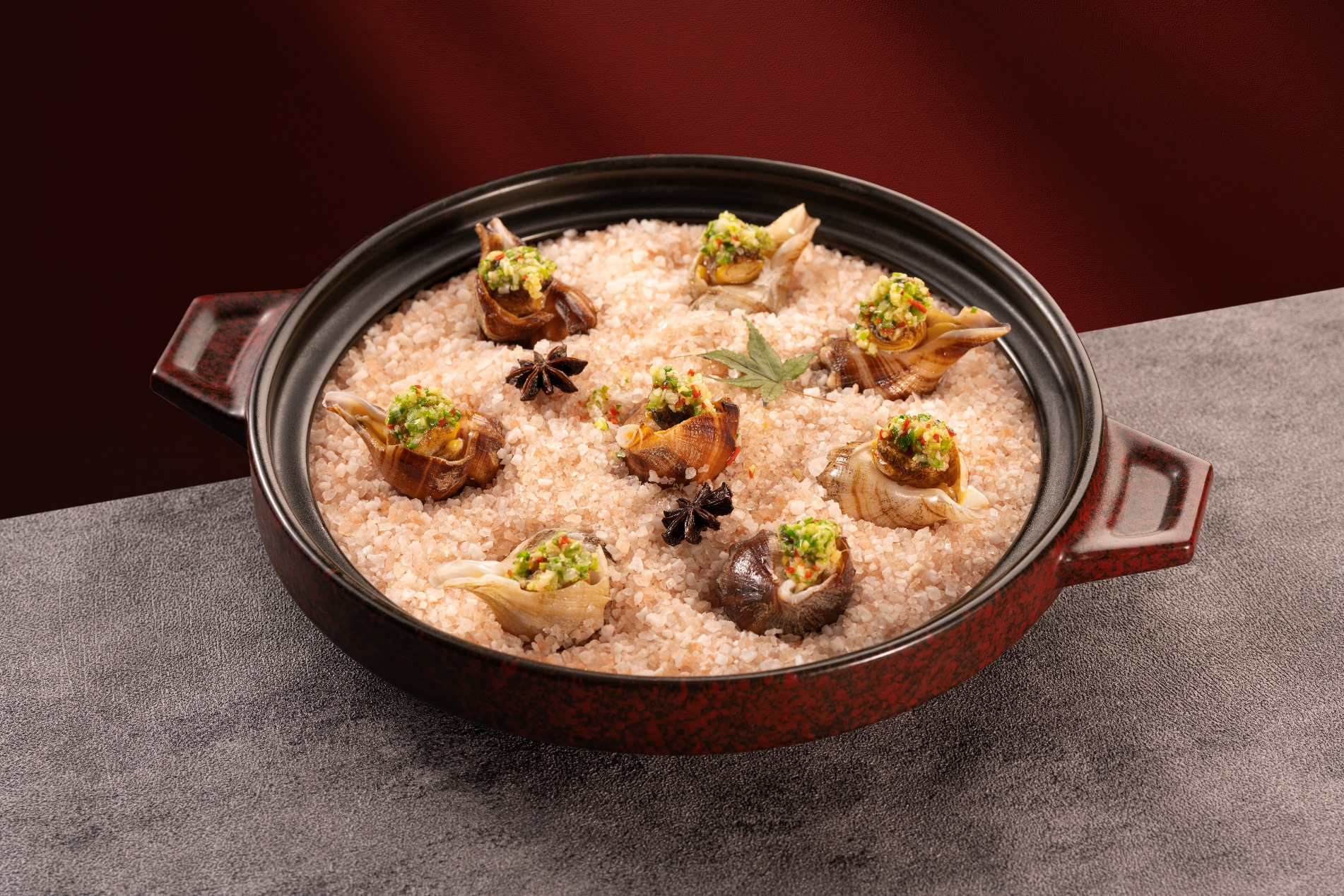 臻选东海角螺,入沸水焯煮取肉,佐以秘制酱料腌渍入味,再巧塞回壳。以玫瑰盐铺底的砂锅炙热焗封,烈焰升腾,盐香与海韵交织。五分钟的焗香之后,螺肉鲜香饱满、质地弹嫩,唇齿间尽是海岸的咸香与烟火的热烈。