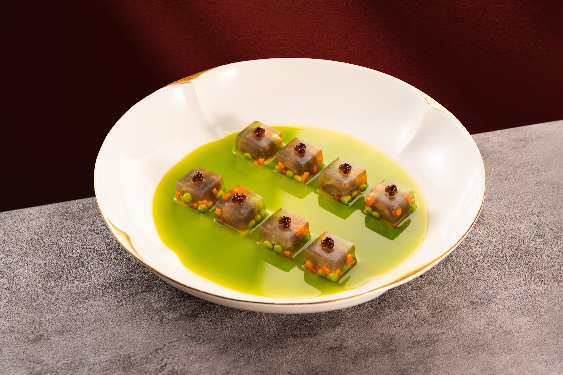 深海海参轻烹至微韧,配以意大利黑醋特制啫喱,口感独特。黑醋的酸香与海参的鲜美交织成一幅异域风味的画卷,啫喱的透明质感更添现代感与视觉享受。