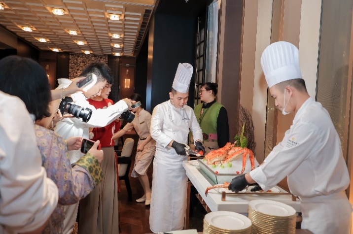 随后,新任中餐行政总厨梁家千师傅及其精英团队正式登台亮相,成为全场焦点。团队以一场精彩的“上菜秀”展示了精湛技艺与创意理念——现场拆解重达十斤的阿拉斯加帝王蟹,将蟹膏、蟹黄及各部位鲜肉细致分装,配以多种风味酱汁,供宾客依个人喜好搭配享用。这场兼具视觉观赏性与互动体验的“蟹”逅,赢得了现场阵阵掌声。