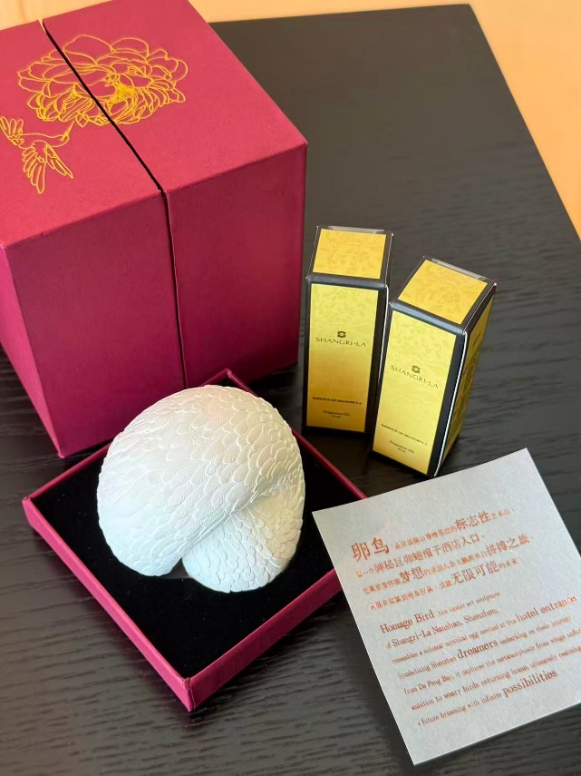 酒店管理团队在晚宴尾声特别准备了情意深厚的伴手礼——以酒店标志性艺术品“卵鸟”为灵感打造的香氛精油礼盒,寓意深圳人不断奋进,终将大鹏展翅,自由翱翔的精神。此款礼盒亦是酒店开业香氛石伴手礼的升级之作,谨以此感谢各位来宾和媒体朋友两年来的一路相伴与深情支持。