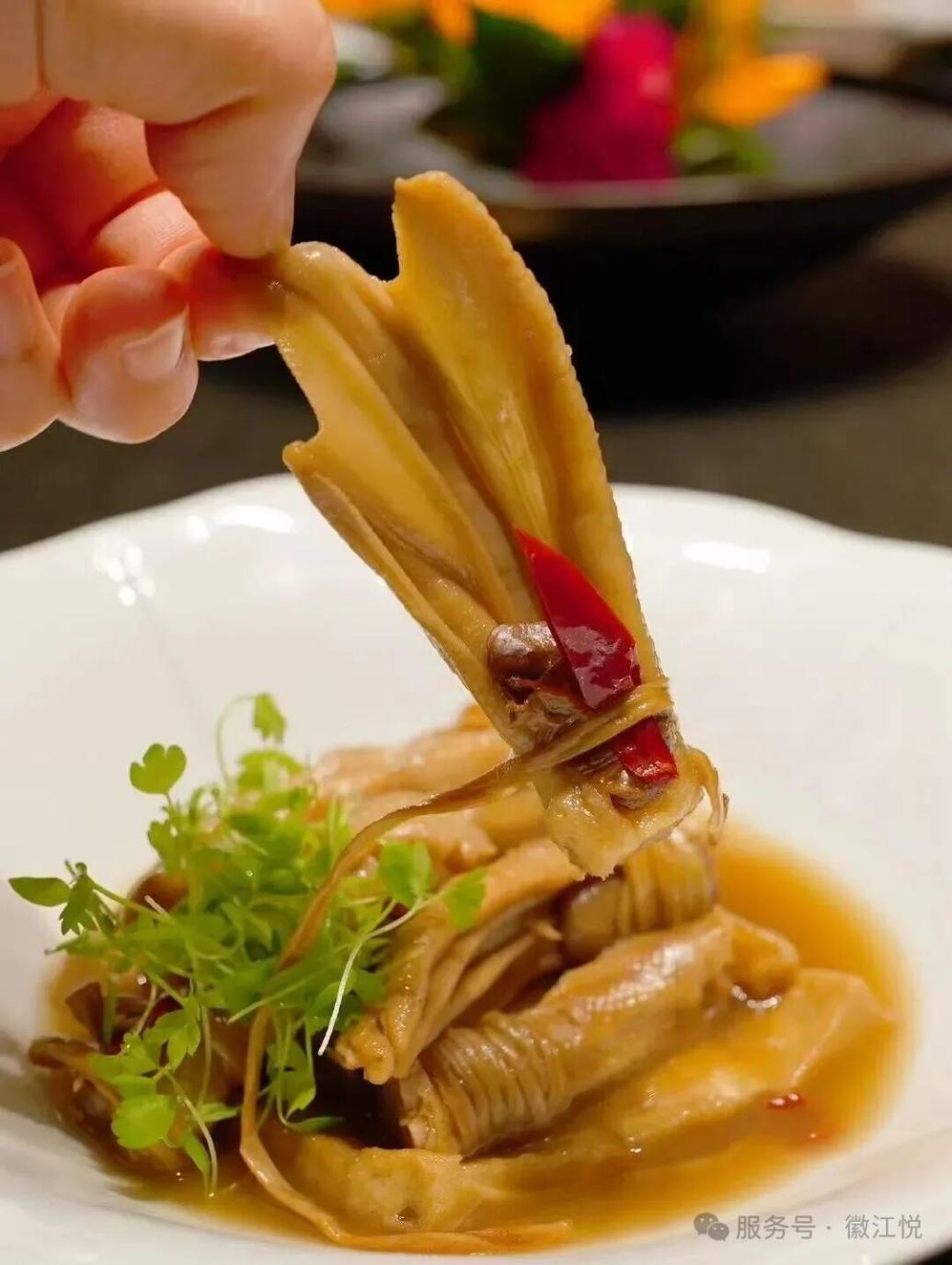 这道风味的起点,是宣城溪涧旁独有的鸭种。其爪部胶质丰厚,经古法香料浸润后,化为颤巍巍的凝脂。
