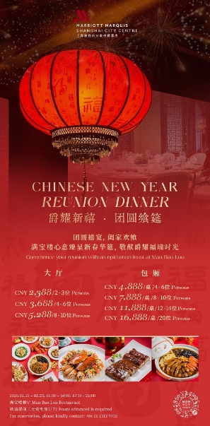 中国上海,2025年2月 — 骏马迎春,福映盛筵。新春团圆佳序,上海雅居乐万豪侯爵酒店臻呈新禧礼遇,诚邀宾客共赴璀璨新春,以珍馐美馔贺岁,让浓情暖意盈满团圆时刻。