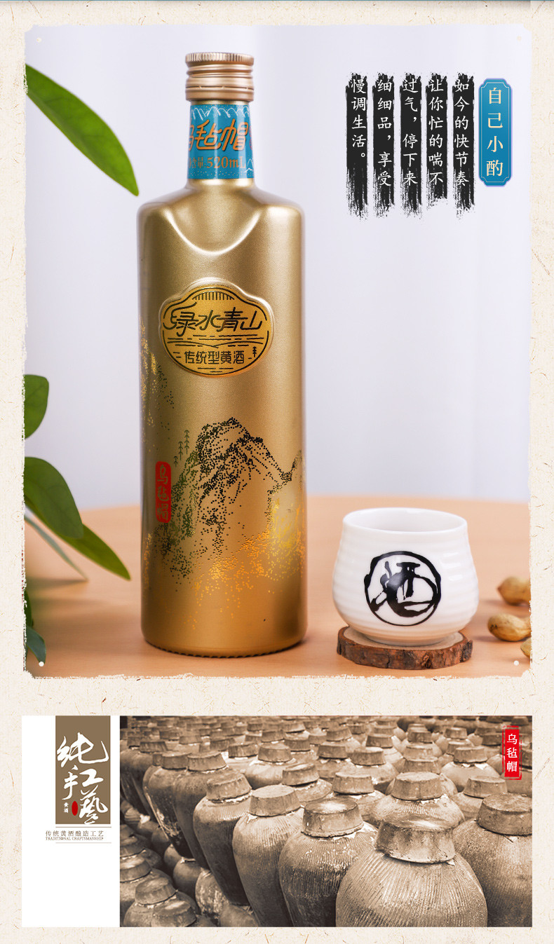 江南的春,更是清柔的,悠远的。这份温润,与乌毡帽“绿水青山”黄酒的气质,天生契合。酒如其名,它萃取安吉龙王山Ⅰ类山泉水的清冽,甄选本地优质好米的醇厚,沿用千年传统曲种与发酵古法,历经180次配方打磨,在时光的沉淀中,酿就一盏澄澈如溪、温润如玉的佳酿,恰似江南春日的绿水青山,清透中藏着厚重,淡雅中蕴着绵长。