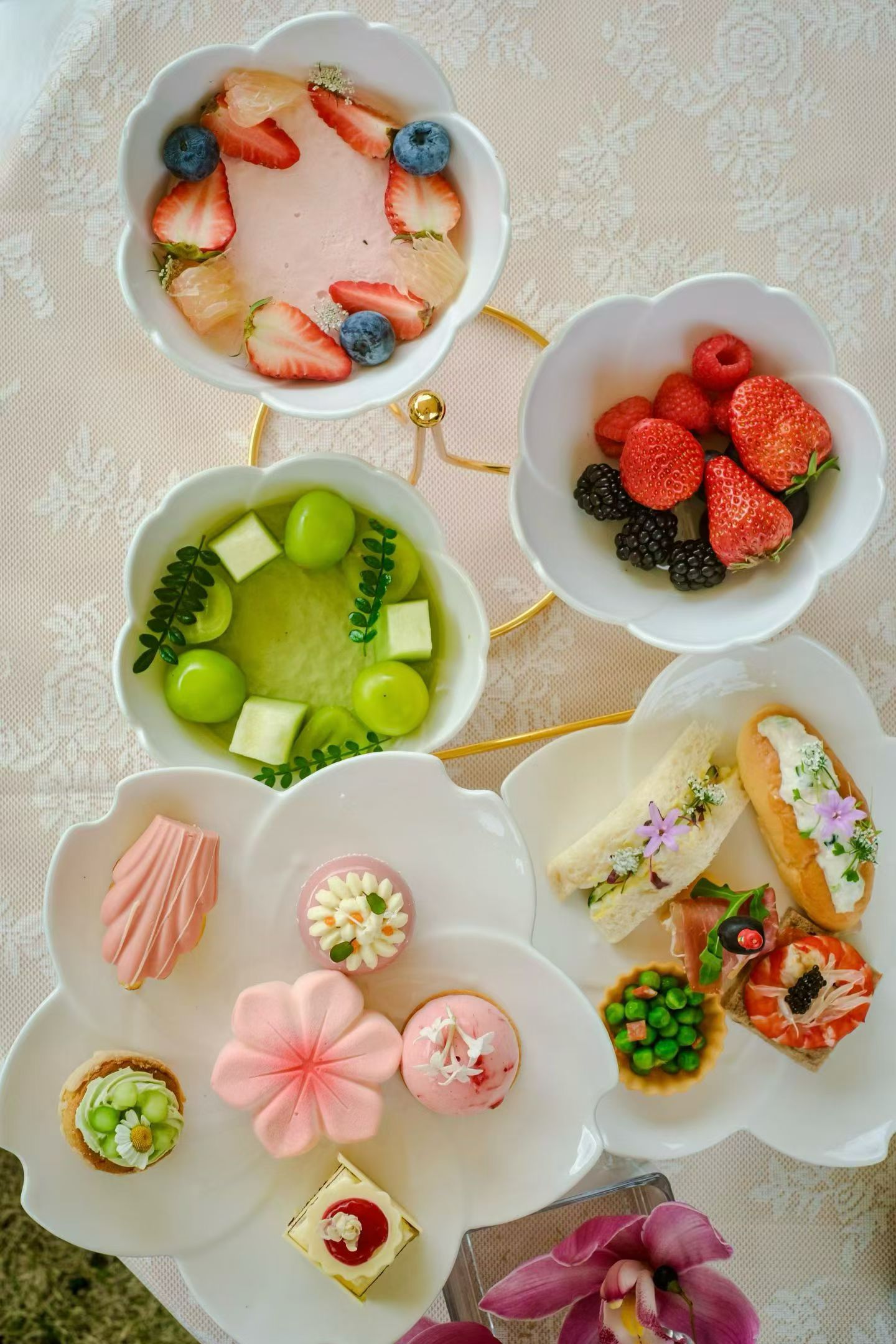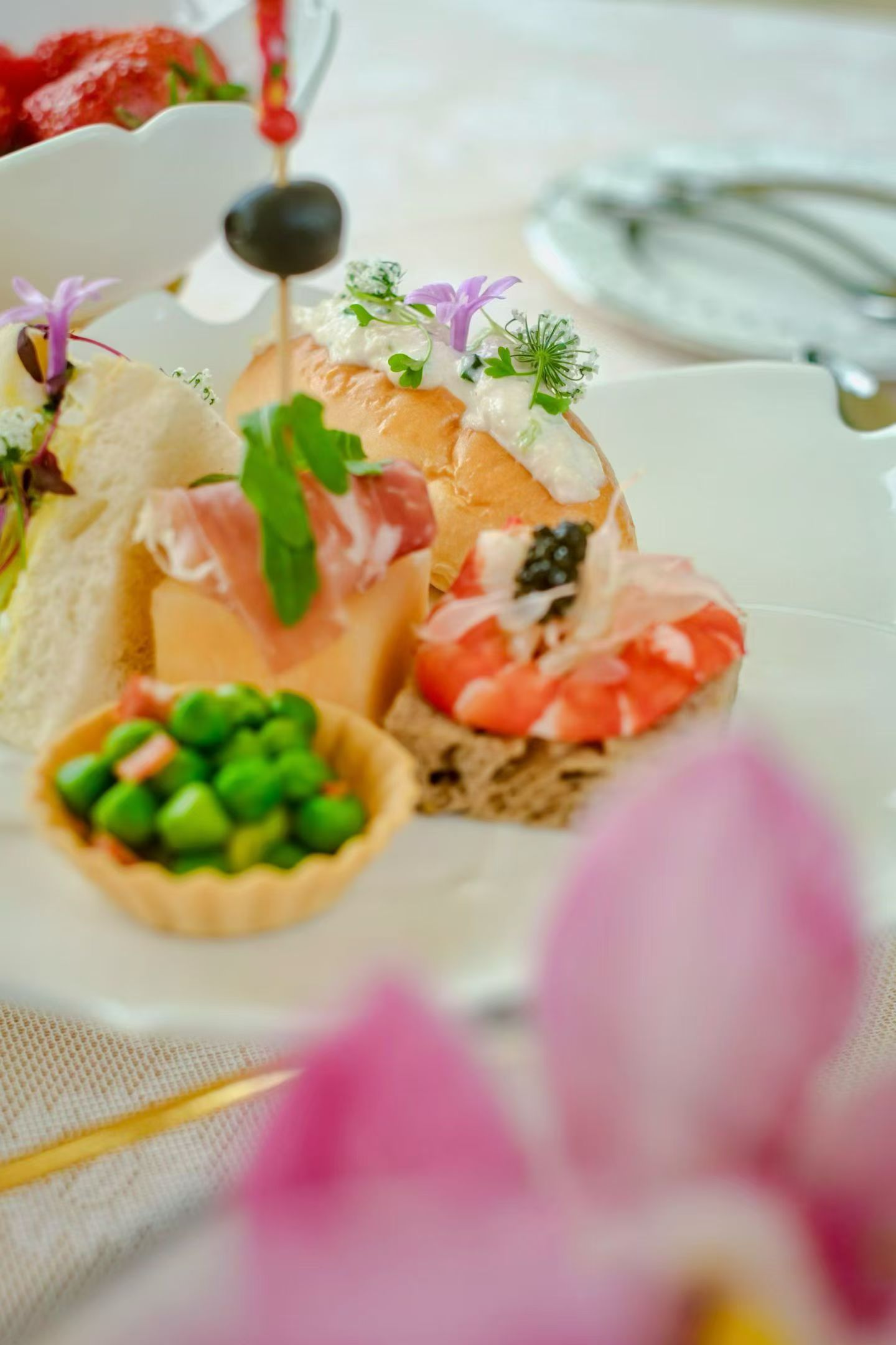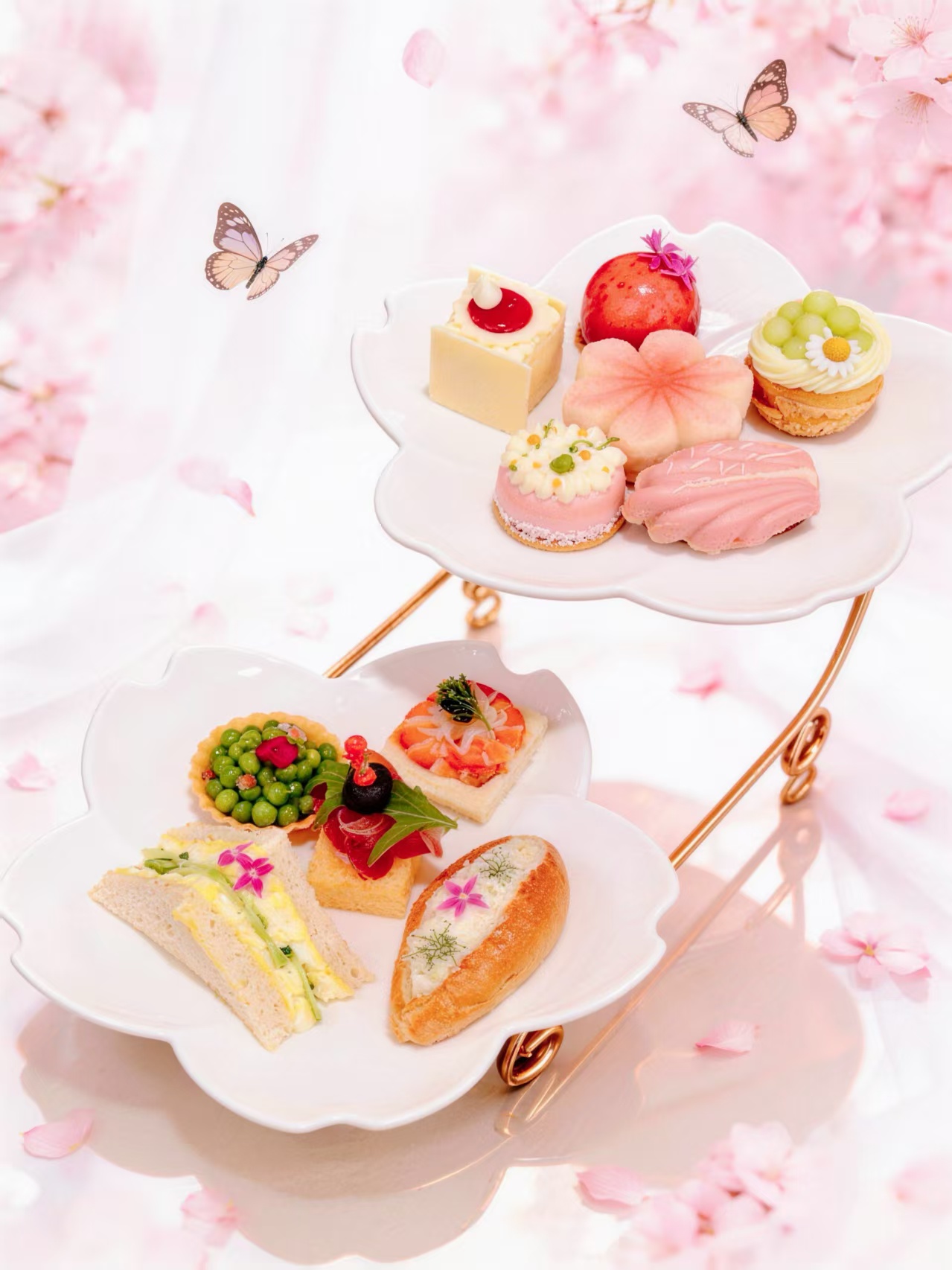 采撷樱花灵感的甜品,呈现出春日惬意与美好。另有西班牙火腿蜜瓜、鸡蛋黄瓜三明治、鱼子酱甜虾三明治、蟹肉面包三明治等咸点,口感层次丰富,与您共谱春天的乐章。