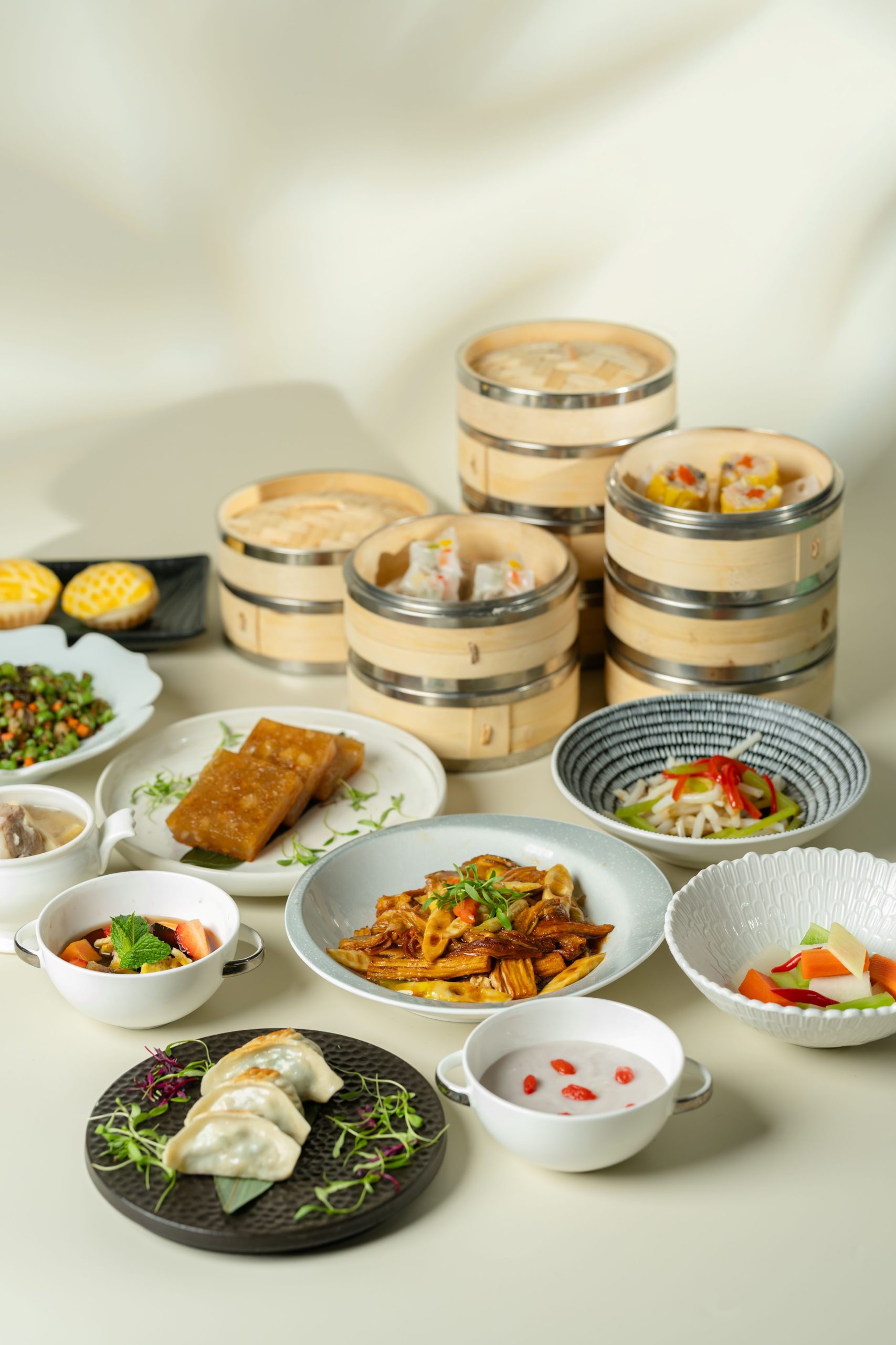 新季菜单以“春鲜”为核心,坚持手工现做、现点现蒸。「黑松露野菌饺」以馥郁菌香铺陈层次,「韭菜鲜虾饺」清鲜爽口,尽显时蔬本味;「竹笋烧麦」则将春笋的脆嫩融入经典,口感清润。搭配一盅「竹笋排骨汤」,汤色清亮,鲜意自然铺展,为整场味觉序章注入温润气息。