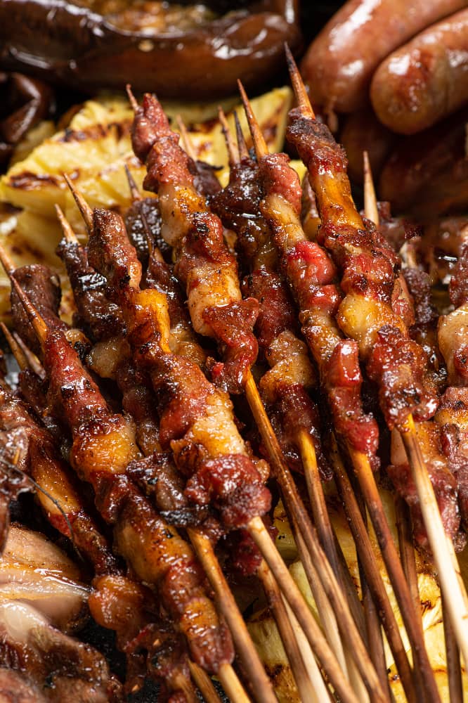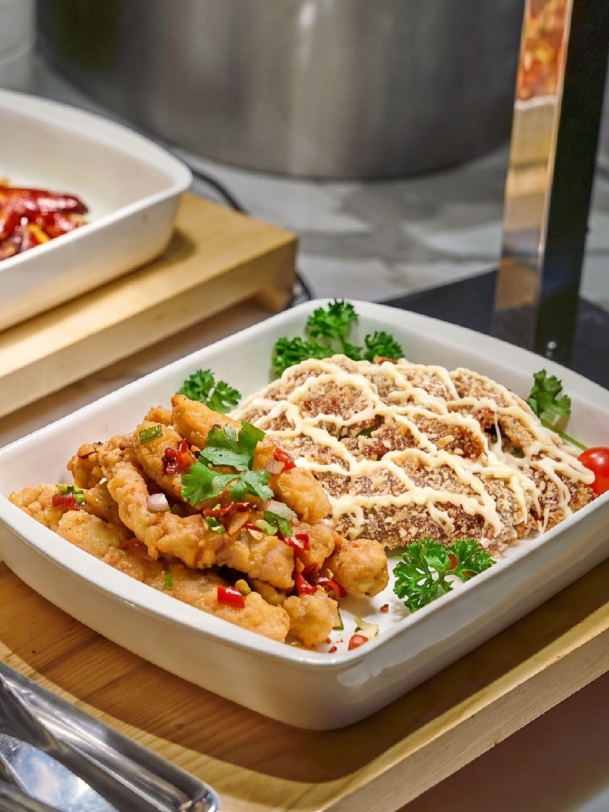 自助餐台错落有致,每一档口皆汇聚严选佳肴,呈现考究品质。冰镇海鲜档不限量供应青口贝、蛤蜊与翡翠螺,保留了海鲜的鲜甜本味。刺身区则主打现场厚切三文鱼,肉质肥厚油润,无论是追求丰腴口感的刺身,还是贴心备有的火炙做法,皆能满足不同口味宾客的偏好。烧烤区同步供应原切法式羊排,大块厚实,现烤现取,外焦里嫩;手掌般大小的乳山生蚝在明火烤盘上滋滋作响,佐以金黄蒜蓉,一口鲜美满足。热菜档口亦汇集了避风塘椒盐虾、三杯鸡、热卤鸭头鸭掌等特色美食;针对亲子家庭,餐台还贴心备有薯条与香炸鸡块,照顾到每一位小宾客的口味需求。